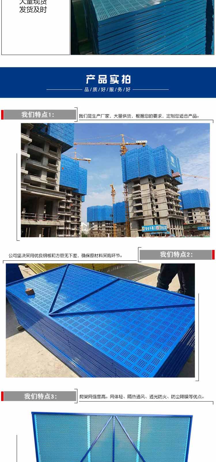 爬架網(wǎng)片重量輕,方便安裝。顏色多種,常用顏色有藍色,……